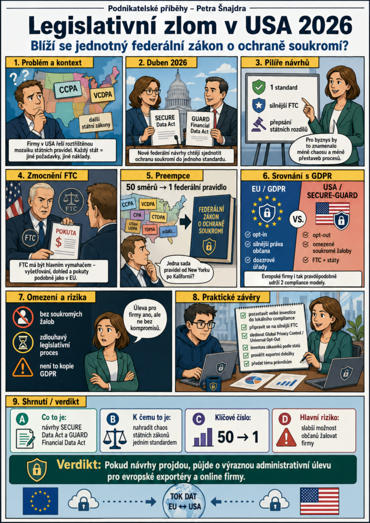 Na konci dubna 2026 představili američtí zákonodárci návrhy SECURE Data Act a GUARD Financial Data Act. Tyto federální návrhy mají za cíl sjednotit roztříštěnou síť státních zákonů do jednoho standardu, což by mohlo zásadně změnit podmínky pro evropské firmy působící na americkém trhu.